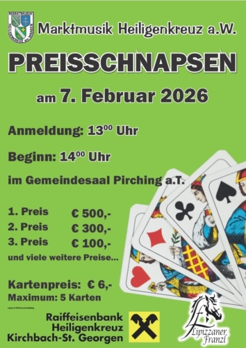 Am Samstag, dem 8. März 2025, fand im Gemeindesaal Pirching am Traubenberg das traditionelle Preisschnapsen der Marktmusik Heiligenkreuz am Waasen statt. Zahlreiche Schnapserinnen und Schnapser stellten sich dem Wettkampf um die begehrten Preise.